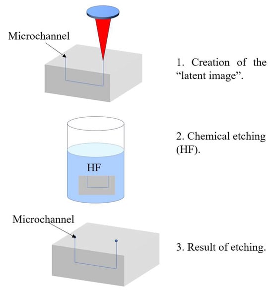 For the fabrication of hollow microchannels, femtosecond laser processing is typically combined with a two-step approach: laser writing followed by chemical wet etching. During the laser writing step, femtosecond pulses modify the chemical structure of the irradiated regions, creating a “latent image.” In photosensitive glasses such as Foturan, this process involves the generation of free electrons that reduce silver ions to form silver nanoclusters. Upon thermal treatment, these clusters serve as nucleation sites for the formation of a crystalline lithium metasilicate phase, which is selectively dissolvable in hydrofluoric acid (HF). In fused silica, structural modifications such as a reduction in Si–O–Si bond angles occur, and linearly polarized lasers can induce the formation of periodic nanogratings, which enhance the selectivity of the subsequent etching process [56].
