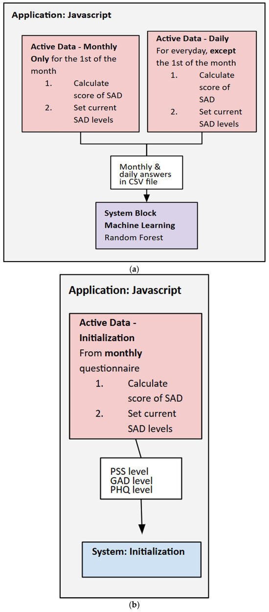(a–d). Device system flowchart, the operational architecture for wellness and stress level assessment. Components include (a) the monthly and daily active data (JavaScript ES2024) calculation; (b) the initialization for determining baseline and daily wellness metrics; (c) machine learning model (random forest and support vector machine) operating loop for predicting wellness; and (d) the overall system flow, including data transfer via the MCU and visualization via the application dashboard (JavaScript).