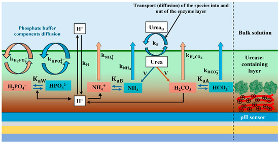 The growing demand for reliable and sensitive urea detection has also driven extensive efforts to develop mathematical models that describe the complex physicochemical processes within biosensors. For potentiometric pH-based biosensors modified with immobilized enzymes, the sensor’s response arises from an intricate interplay of biochemical and electrochemical reactions. This response is influenced by numerous factors including the enzyme immobilization method and layer geometry [5,19], the catalytic efficiency and enzyme–substrate interaction mechanisms [10,11], the buffer composition, pH, stirring rate [20,21], and ambient temperature as well as the concentration gradients between the sensing surface and the bulk solution [12]. Experimental approaches alone are often insufficient to isolate and quantify the individual effects of these parameters. Therefore, a deeper understanding of biosensor behavior requires integrating experiments with theoretical models. Such models can estimate key characteristics including the actual reaction rate (v), the Michaelis–Menten constant (KM), the maximum reaction rate (Vmax), and the rate constants for substrate, product, and buffer transport.