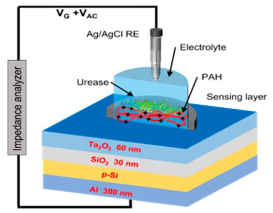 Among the various urea biosensing approaches, field-effect devices have seen notable advancements. In particular, the electrolyte–insulator–semiconductor capacitive (EISCAP) sensor has emerged as a powerful platform [7,8,9,10,11,12,13,14,15]. The pH-sensitive EISCAP used in this work consists of an Al/p–Si/SiO2/Ta2O5 structure functionalized with a urease-rich layer (polyallylamine hydrochloride (PAH) and urease), which transduces enzymatic pH shifts at the gate interface into measurable capacitance or voltage changes [7,8]. EISCAP sensors are popular due to their simple design and straightforward, cost-effective fabrication (no photolithography or complex encapsulation required) [9,10]. Tantalum pentoxide (Ta2O5), used as the gate insulator, offers excellent chemical stability and near-Nernstian pH sensitivity (~59 mV per pH) [11], enhancing the transduction of urease-catalyzed pH changes. As a result, the EISCAP platform achieves high sensitivity and a wide dynamic range for analytes like urea [12]. Notably, Welden et al. employed EISCAP sensors for the measurement of acetoin in wine and beer media, demonstrating the versatility of this platform biochemical sensing application [13]. Compared with many existing urea sensors and benchtop assays, the reported EISCAP technology provides a unique combination of specificity (through the bio-selective urease layer), sensitivity (through the highly pH-responsive Ta2O5 transducer), and operational convenience. In summary, it enables reagent-free and real-time urea detection with excellent stability [13,14,15,16], addressing several limitations of conventional methods.