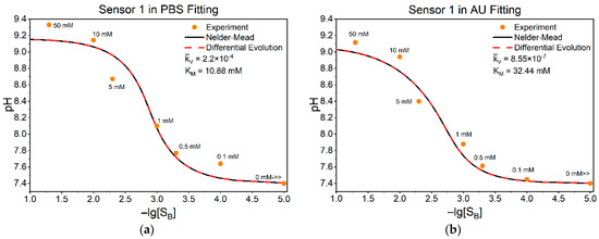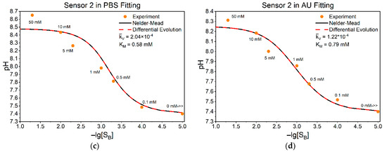 Figure 4 shows four characteristic examples of measured data for the pH at the sensing layer, corresponding to some values of urea concentration in the bulk. Panels (a) and (b) correspond to the first sensor measured in PBS and AU, respectively, while panels (c) and (d) show the corresponding fittings for the second sensor under the same conditions. The extracted parameters and are indicated for each fit. Since the zero concentration of substrate in the logarithm goes to infinity or undefined, it is inconvenient to show this point on the graph, so we replaced the point 0 with “0 mM>>” at (10–5 mM). The same code as in Section 3.1 was used for fitting, with some changes to meet the conditions of our experiments.
