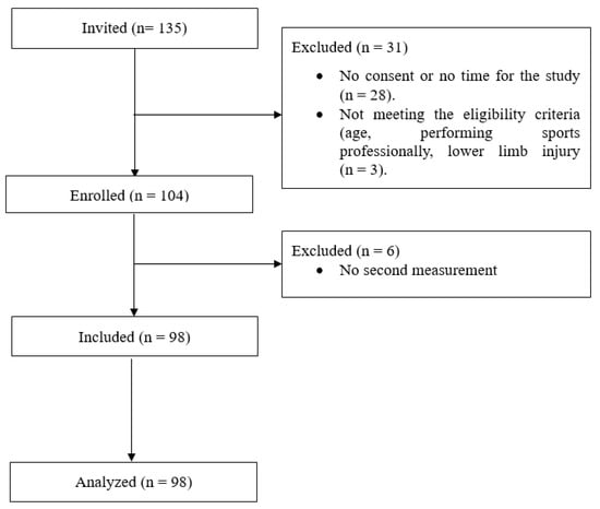 One hundred and thirty-five persons were invited to this study. As twenty-eight persons did not consent to participation in the study, and three persons did not meet the eligibility criteria, one hundred and four participants were recruited. Six participants did not perform the second measurement, and their results were excluded from the final analysis. Finally, we analyzed the data of ninety-eight participants. All participants were of Caucasian ethnicity. The study participant flowchart is presented in Figure 1.