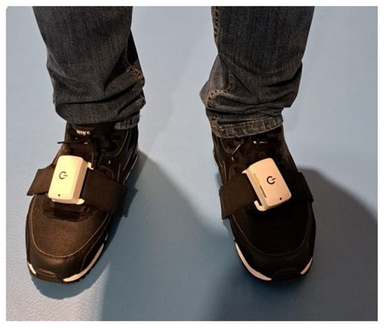 In this study, we analyzed gait spatiotemporal parameters, such as walking speed (km/h), cadence (steps/minute), and stride length (cm). During the study, the participants were wearing clothes and shoes they typically wear to imitate real-life conditions. The inertial sensors were placed on the participants’ shoes with a dedicated Velcro strap. After each sensor placement, participants were asked whether the sensors felt comfortable and acceptable. Before each test, participants were also asked to walk at a comfortable speed to ensure they felt at ease. Then, the participants were asked to walk a designated 10 m linear distance along the corridor at their usual, self-selected walking speed, reflecting their typical ambulation in daily life. Except for that, no additional instructions were given to the participants. For each measurement, each rater put sensors on the participants’ feet, and after the measurement, they removed the sensors from the feet. The sensors’ placement is shown below, in Figure 2.