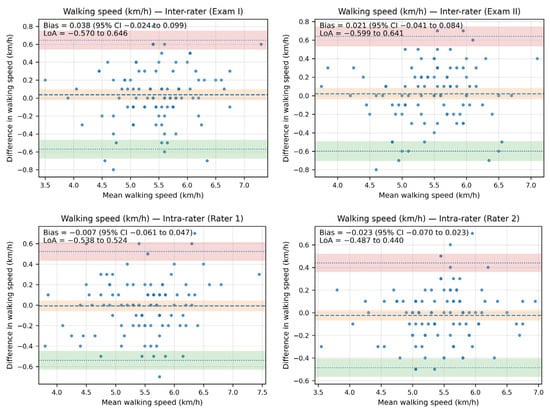 The Bland–Altman analysis revealed that the bias between the walking speed measurements—both inter- and intra-rater—was minimal, as the line of equality fell within the 95% confidence interval (CI) of the mean difference value in all plots. Additionally, most of the data points were located within the limits of agreement (LoA).
