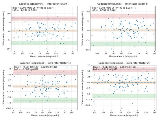 The Bland–Altman analysis revealed that the bias between the cadence measurements—both inter- and intra-rater—was minimal, as the line of equality fell within the 95% confidence interval (CI) of the mean difference value in all plots. Additionally, most of the data points were located within the limits of agreement (LoA).