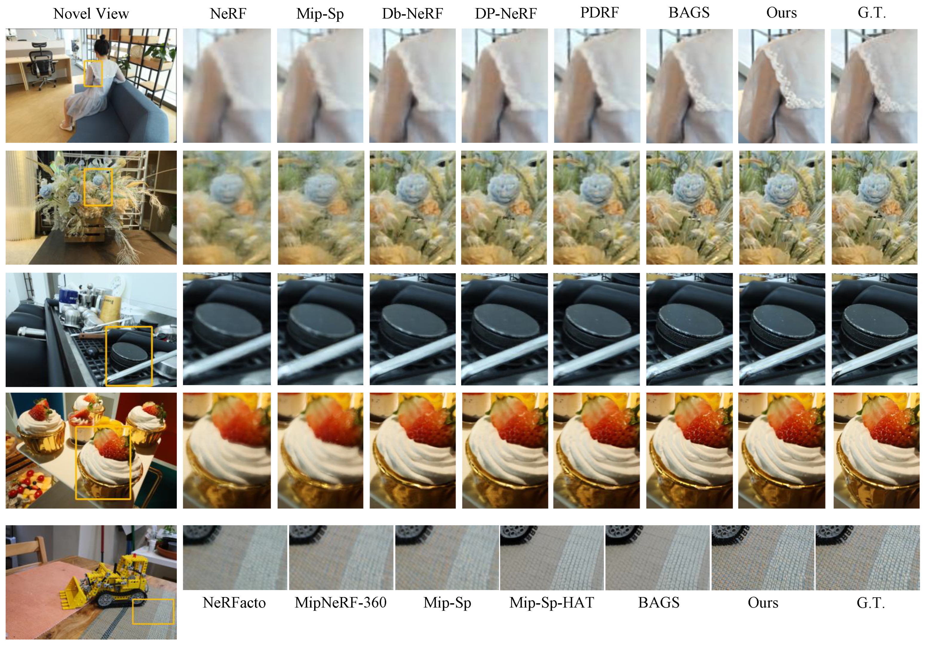 - Peng, C.; Tang, Y.; Zhou, Y.; Wang, N.; Liu, X.; Li, D.; Chellappa, R. Bags: Blur agnostic gaussian splatting through multi-scale kernel modeling. In European Conference on Computer Vision; Springer: Berlin/Heidelberg, Germany, 2024; pp. 293–310. [Google Scholar]