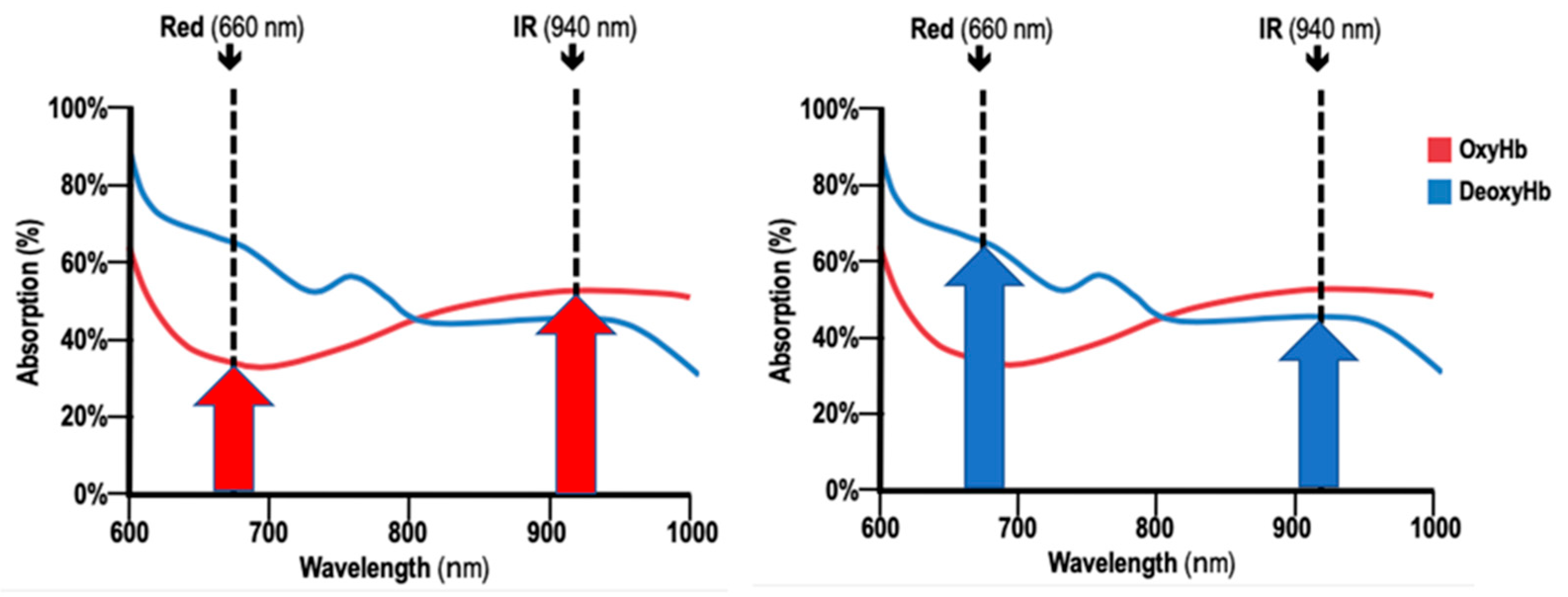 HbO2, absorbs more infrared light and less red light than deoxygenated hemoglobin,