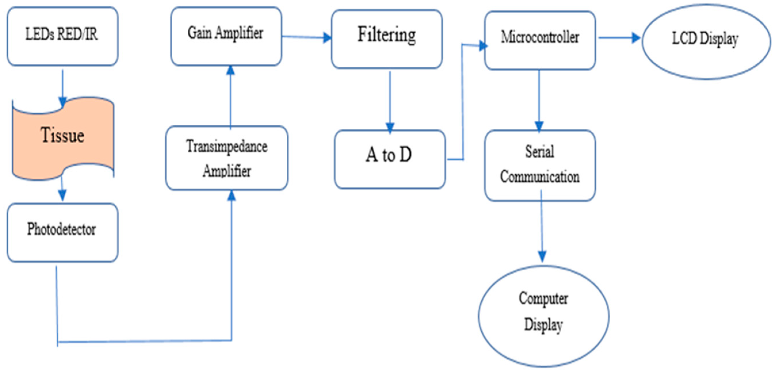 The block diagram illustrating the architecture of the pulse oximeter developed in this study is presented in