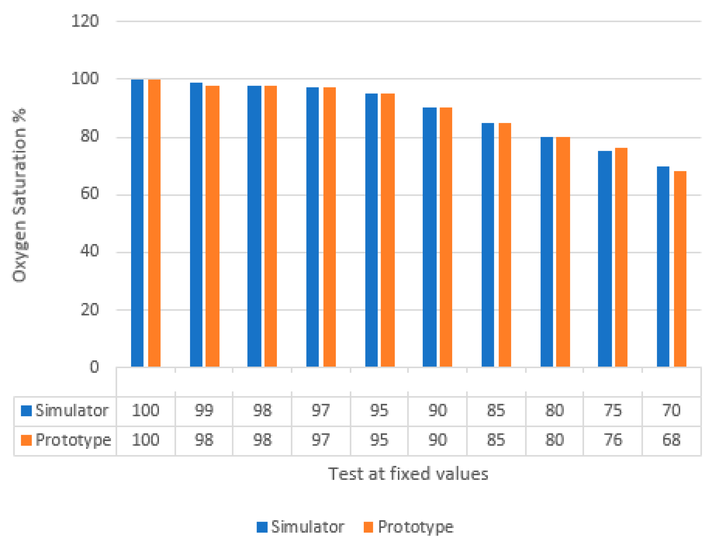 45] was used exclusively to confirm prototype responsiveness under controlled conditions. In accordance with ISO 80601-2-61:2017 requirements, the test was performed by measuring oxygen saturation levels between 100% and 70% under standardized conditions of 80 BPM, with a maximum allowable standard deviation of ±4.00%. The results, obtained from 10 test points within this range and shown in