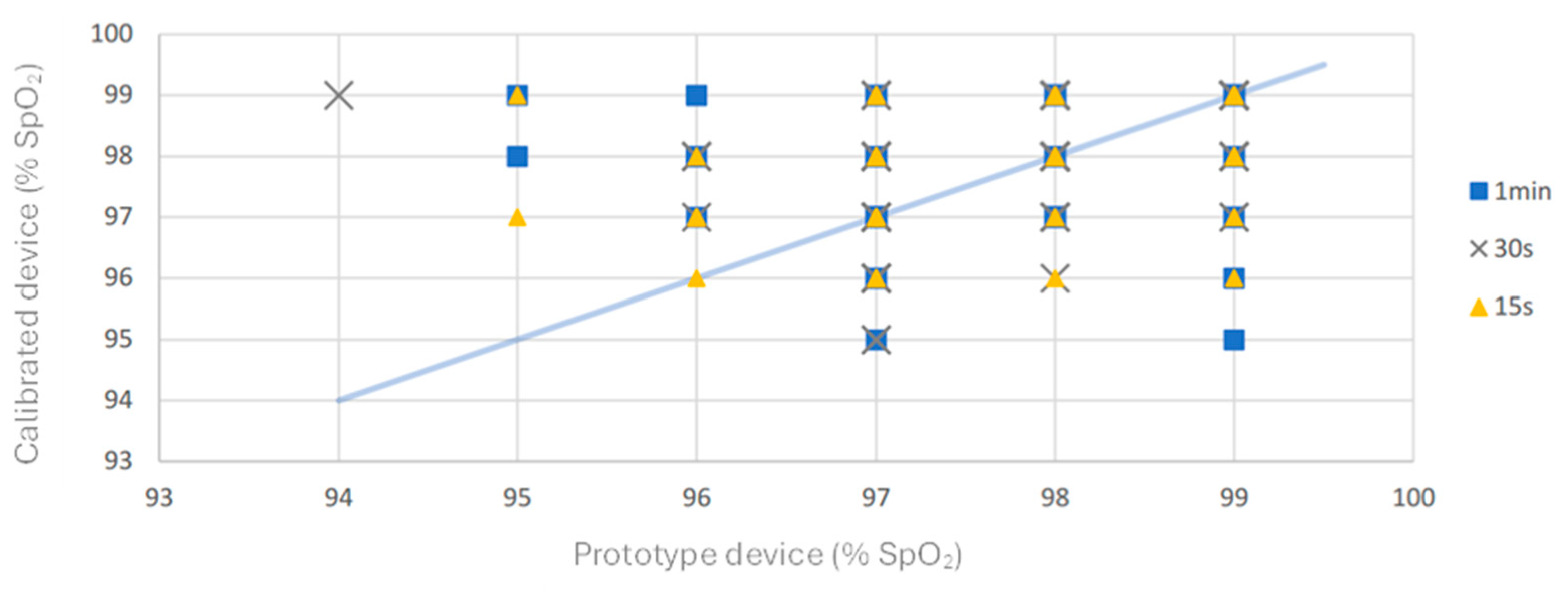Figure 8 illustrates the relationship between the results obtained from our prototype and those from the calibrated reference device across three-time intervals (15, 30, and 60 s).