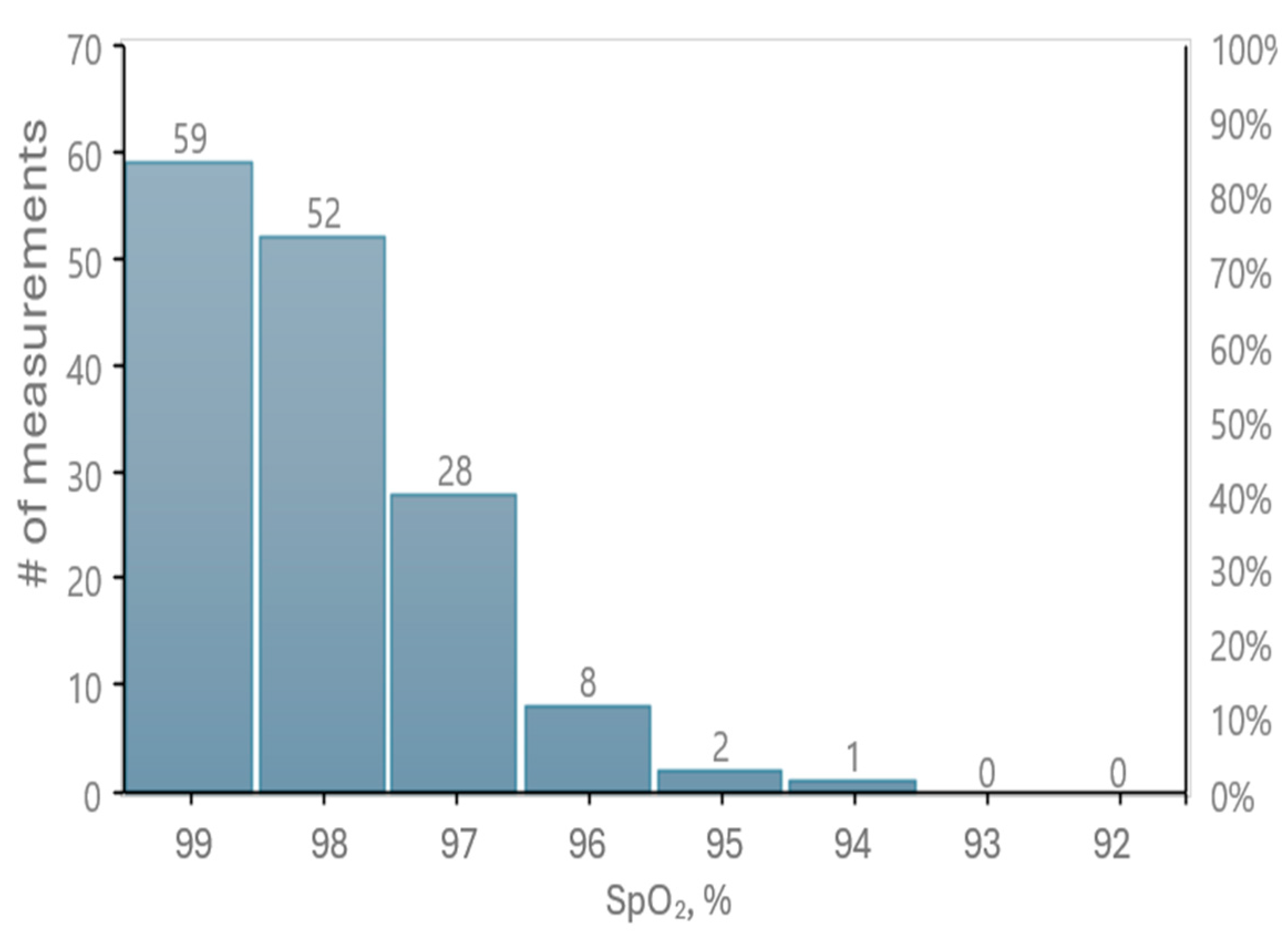 Figure 9 presents the distribution of oxygen saturation values recorded by our prototype.