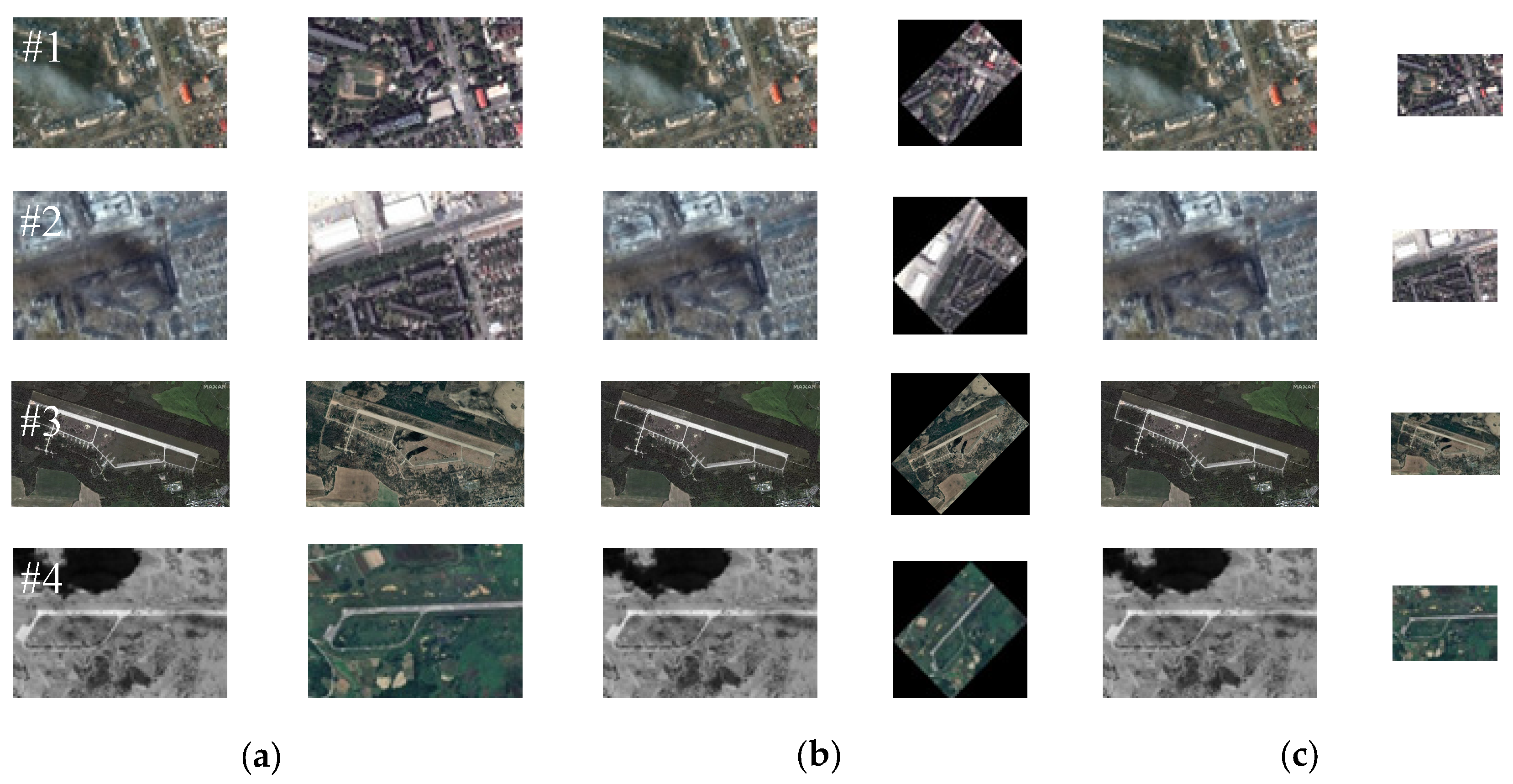 - Zhou, R.; Quan, D.; Wang, S.; Lv, C.; Cao, X.; Chanussot, J.; Li, Y.; Jiao, L. A Unified Deep Learning Network for Remote Sensing Image Registration and Change Detection. IEEE Trans. Geosci. Remote Sens. 2024, 62, 5101216. [Google Scholar] [CrossRef]