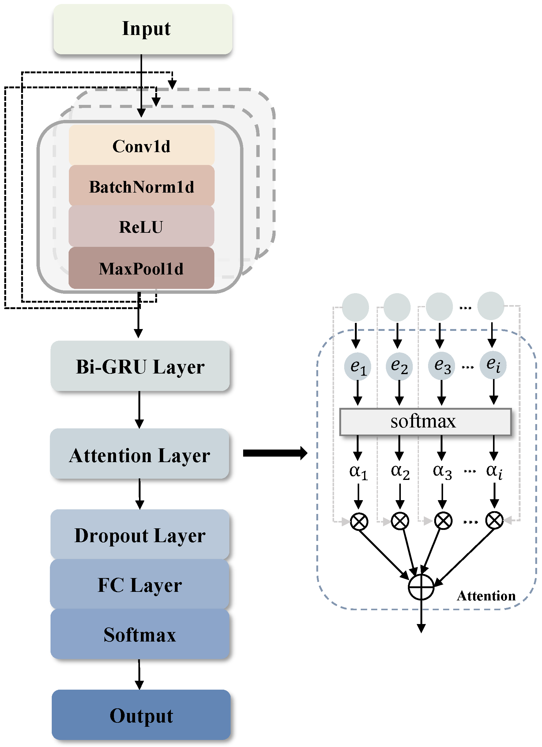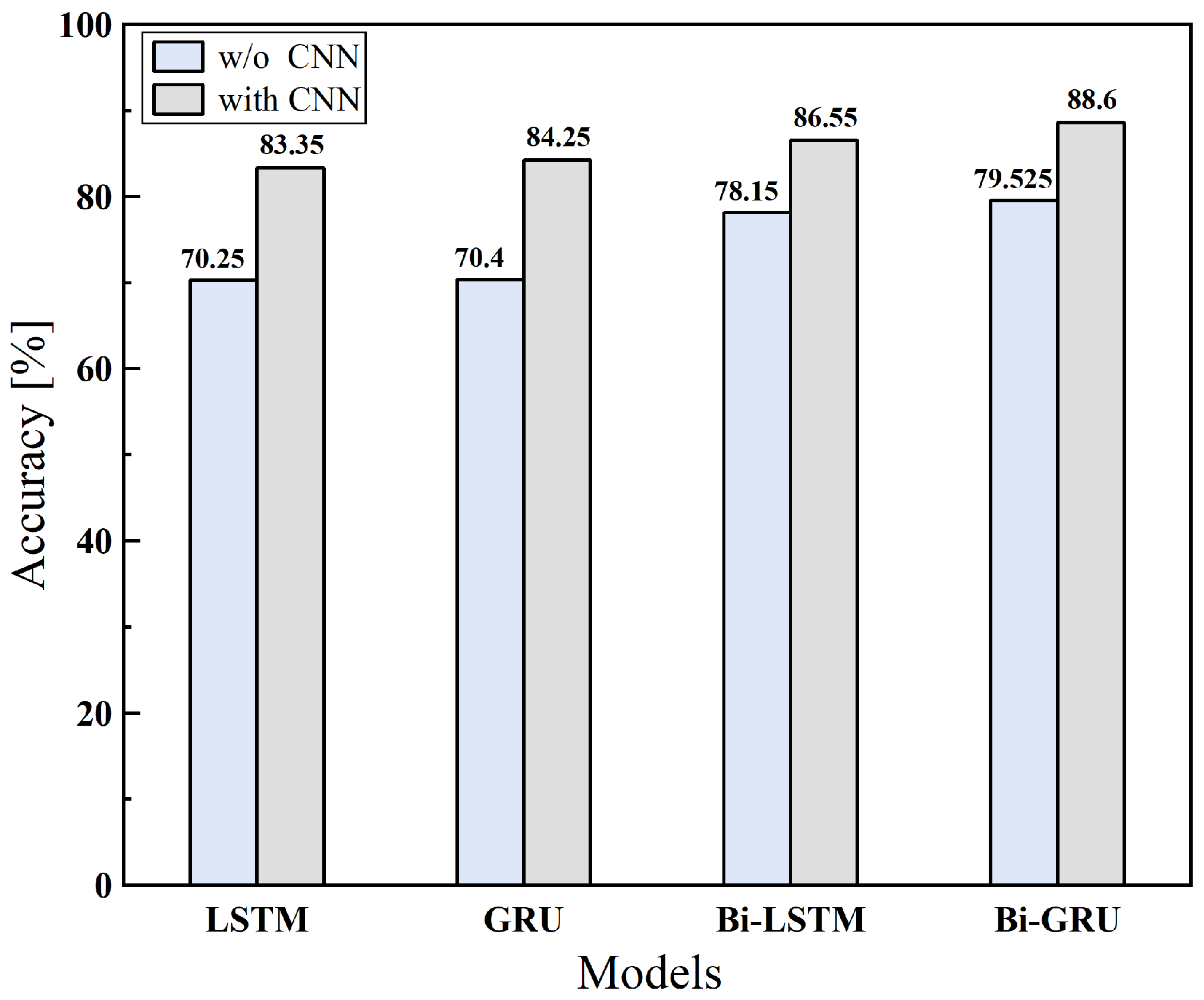 To verify the effect of the attention mechanism, the following ablation study was made. The performance was assessed by adding the attention layer in Figure 6 to the best performing model shown in Figure 8, dubbed CNN-Bi-GRU-Attention model. Correspondingly, the model without attention layer is named CNN-Bi-GRU. The results are shown in Table 3. It is evident that the attention mechanism has a very positive influence on the performance, increasing the accuracy from 88.6% to 93.75%. The core principle of the attention mechanism is to assign weights to the extracted features from Bi-GRU layer based on its significance, allowing the underlying model to concentrate on more discriminative information. By introducing the attention mechanism, the model is better at handling delicate input patterns and thus significantly boosts the performance. Moreover, the training expenditure of CNN-Bi-GRU-Attention model is comparable to the basic model.