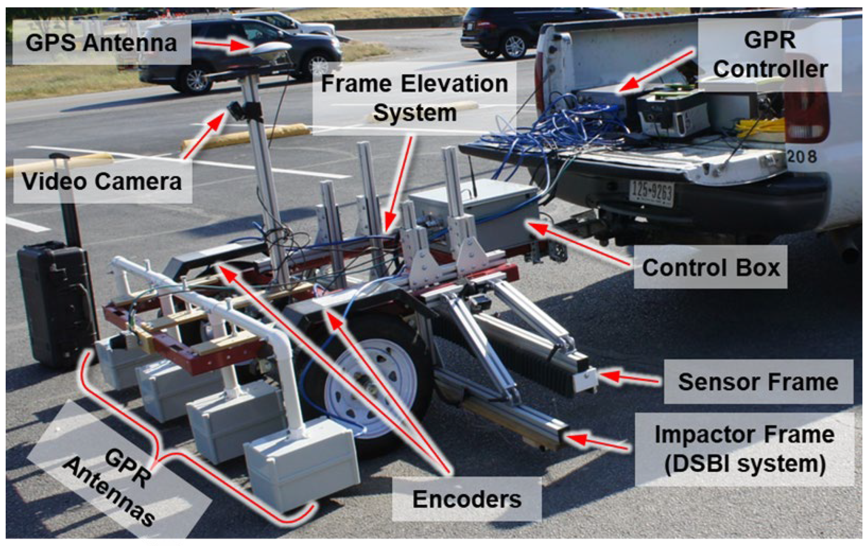 - Guthrie, W.S.; Larsen, J.L.; Baxter, J.S.; Mazzeo, B.A. Automated Air-Coupled Impact-Echo Testing of a Concrete Bridge Deck from a Continuously Moving Platform. J. Nondestruct. Eval. 2019, 38, 32. [Google Scholar] [CrossRef]