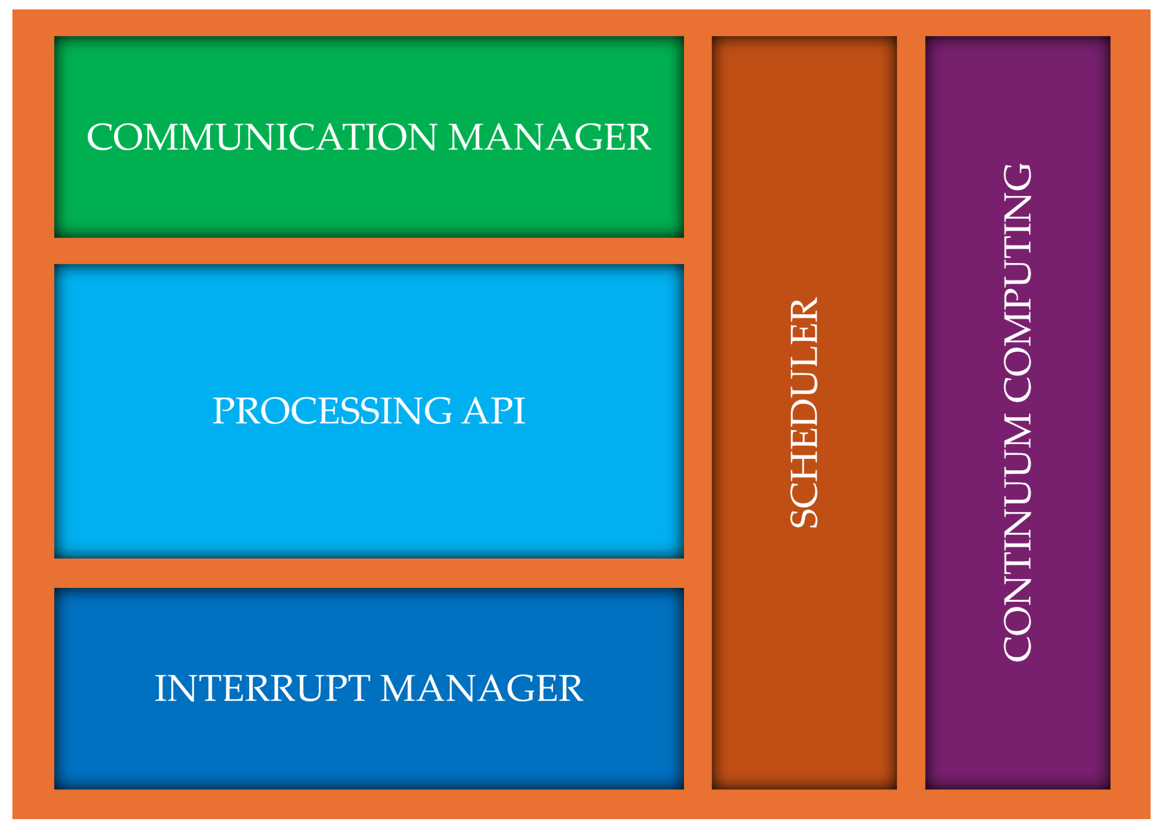 Interrupt Manager—Manages interrupt signals originating from processing APIs (software routines) or hardware accelerators, ensuring timely response and efficient execution.