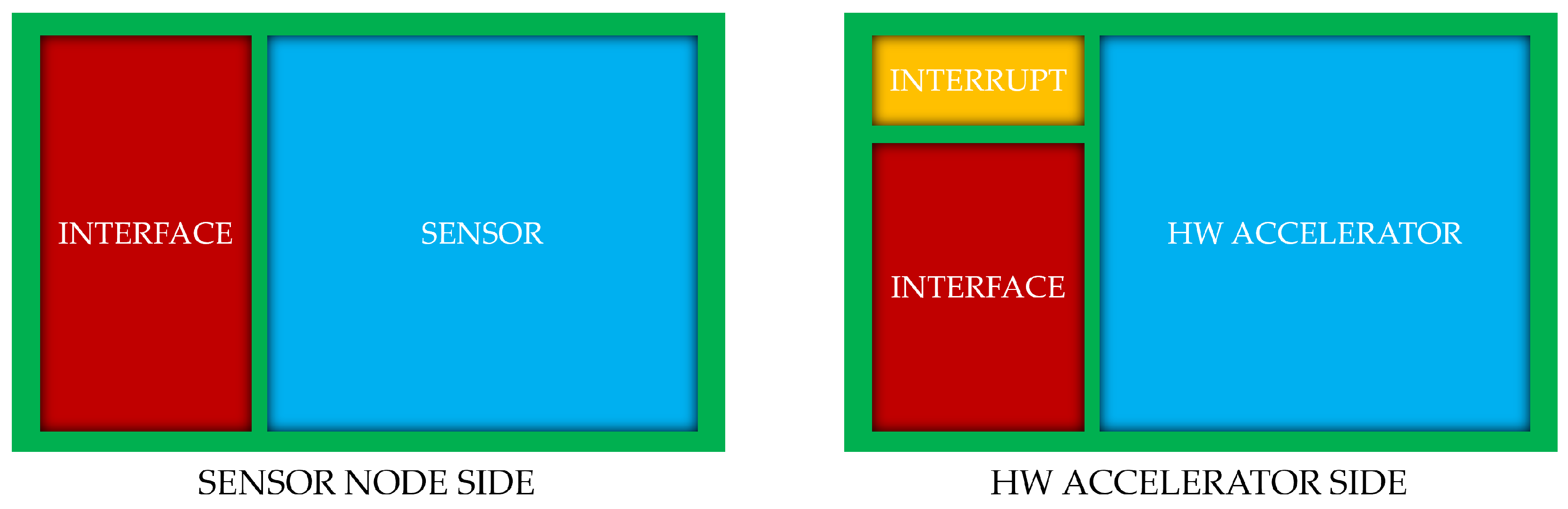 In this case, the operation of acquiring data from the sensors and sending them to the hardware accelerator is managed sequentially, eliminating the need for the scheduler and the interrupt manager. Additionally, the gateway, which typically plays a role when local hardware or software resources are insufficient for processing tasks, is not used in this setup. This is because the selected development board is capable of executing all operations locally, whether entirely in software, entirely in hardware, or through a hybrid approach.