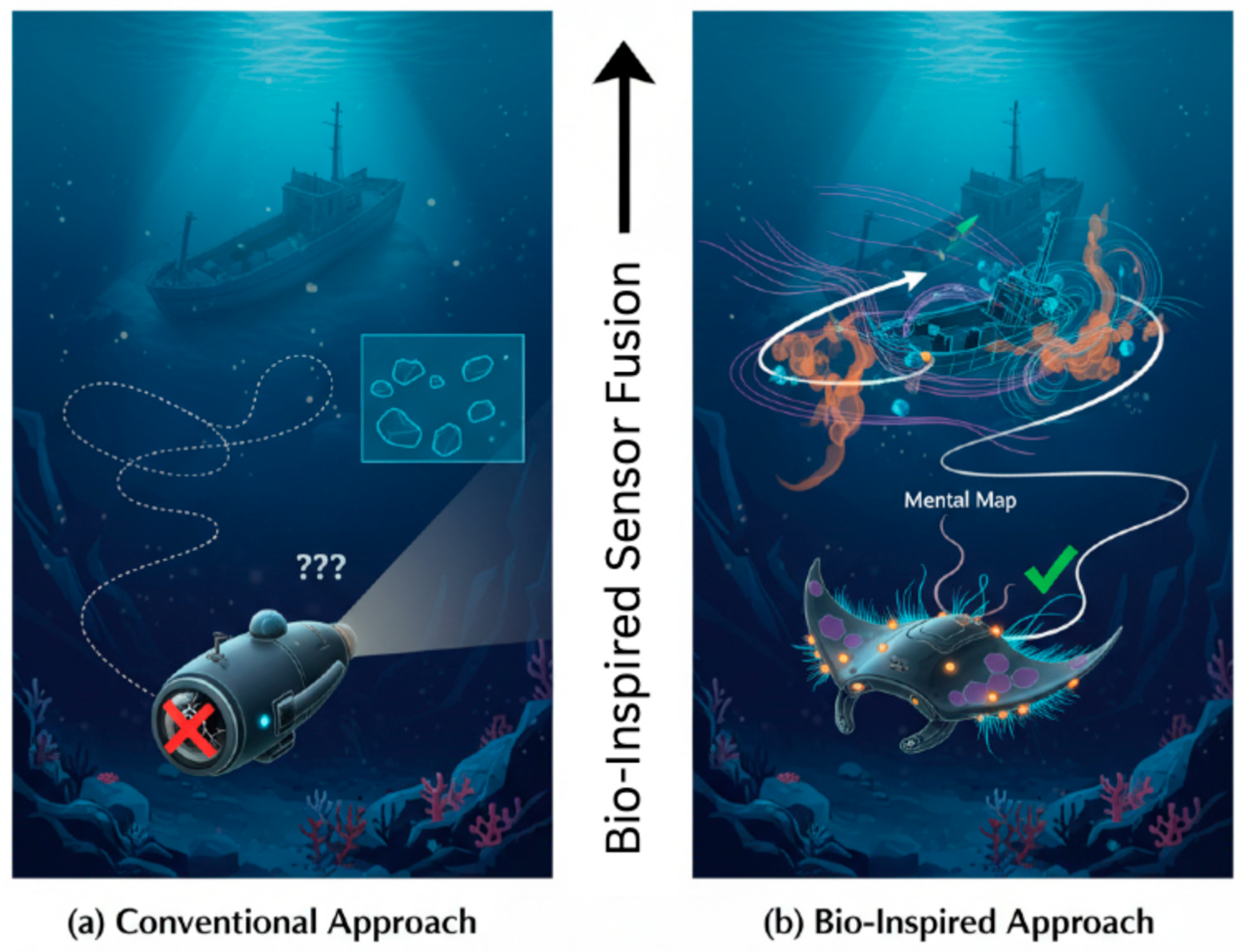 Figure 1. A conceptual diagram illustrating the fundamental differences in perception and strategy between a conventional autonomous underwater vehicle (AUV) and a bio-inspired AUV navigating a complex, murky seabed. The conventional approach (a) relies heavily on a single, degraded sensor modality (e.g., optical camera blinded by turbidity), leading to an incomplete and erroneous world model, collision risk, and navigational drift. In contrast, the bio-inspired approach (b) employs multi-modal sensor fusion mimicking marine fauna by integrating quantum-inspired magnetoreception (purple waves), tactile-chemotactic sensing (orange tendrils), and efficient flow sensing (blue streamlines). This creates a robust, multi-faceted “mental map” of the environment, enabling resilient obstacle avoidance, precise path integration, and successful navigation despite sensory degradation.