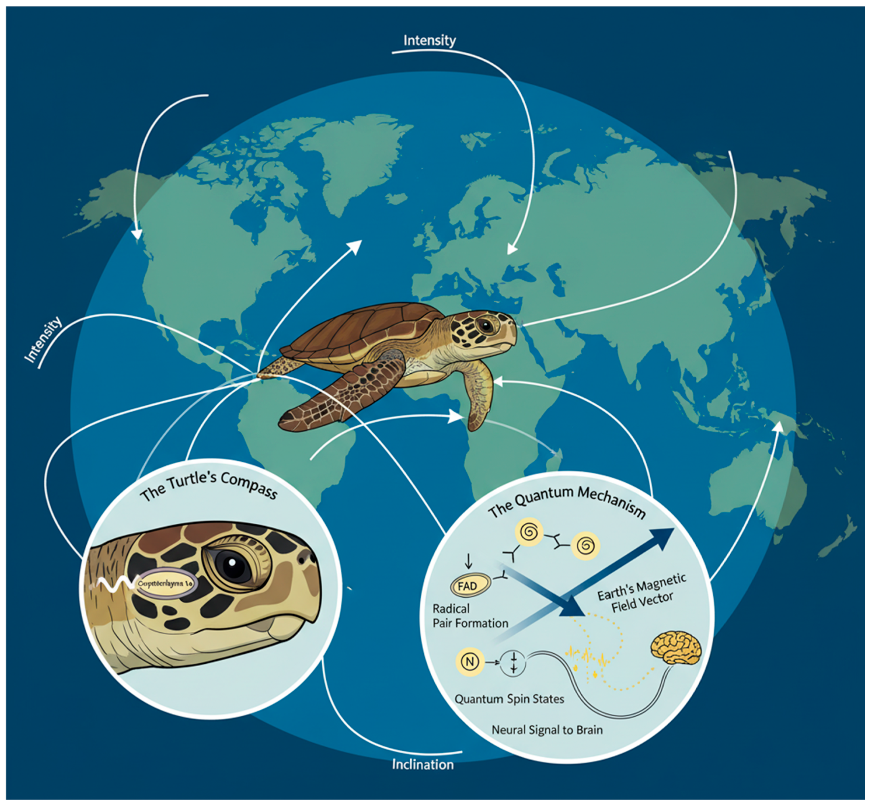 Figure 2. The quantum-assisted magnetoreception mechanism in sea turtles. During transoceanic migration, sea turtles are hypothesized to navigate using a bicoordinate magnetic map of the Earth’s field (main image). This sense originates in the retina, where cryptochrome proteins (Inset 1) undergo a light-induced electron transfer, creating a pair of radical molecules (Inset 2, Step 1). The quantum spin states of these radicals are influenced by the local magnetic field vector (Step 2), modulating the protein’s conformation and ultimately generating a neural signal perceived by the turtle as magnetic information (Step 3). This provides a globally-referenced, drift-free navigation capability.