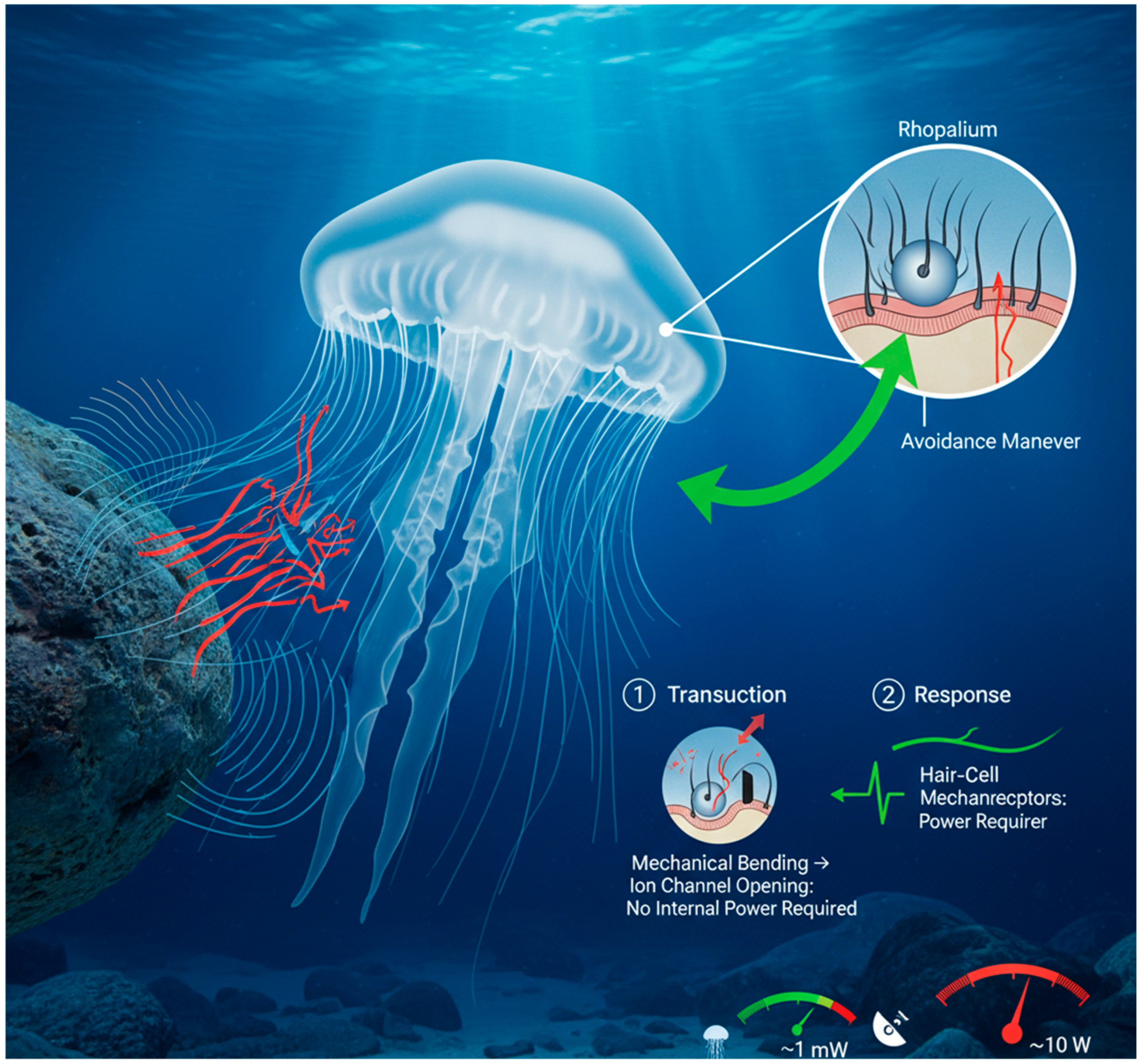 Figure 4. Ultra-low-power hydrodynamic sensing in jellyfish. Jellyfish maintain situational awareness through rhopalia, sensory structures containing mechanosensitive hair cells. These cells detect minute changes in water flow and pressure caused by obstacles distorting the animal’s self-generated flow field. Crucially, detection occurs via direct mechano transduction, requiring no internal energy source to generate a signal. This allows for persistent, always-on environmental monitoring and rapid collision avoidance reflexes at an energy cost orders of magnitude lower than conventional robotic sensors like sonar.