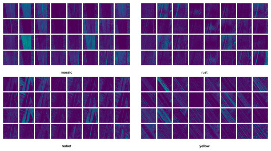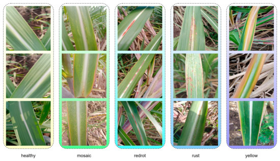 The sugarcane leaf disease dataset used in this study comprises five categories: healthy, mosaic, redrot, rust, and yellow. Specifically, healthy refers to leaves that show no signs of disease and appear normal; mosaic indicates mottled patterns on the leaf surface, typically caused by viral infections; redrot refers to red rot disease, a fungal infection characterized by reddish-brown lesions on the leaves; rust denotes rust disease, which presents as rust-colored, powdery spore clusters on the leaf surface; and yellow represents leaf chlorosis, which may result from nutrient deficiencies or the early stages of disease. This classification system encompasses the major types of leaf diseases commonly observed during sugarcane cultivation and supports targeted automatic identification and diagnosis. Figure 1 illustrates representative image samples for each of the five categories, providing a visual reference for the dataset.