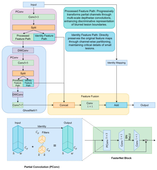 To enhance the model’s capability in detecting multi-scale sugarcane leaf lesions, this study fully replaces the C3K2 structures in the YOLOv11n backbone with CP modules that integrate the lightweight feature generation strategy of GhostNetV1 with the core concepts of GhostNetV2. The CP module, short for Cross Stage Partial Multi-Scale Feature Aggregation, is designed to enhance feature extraction by integrating information across different scales and network stages. It effectively improves the model’s ability to capture fine-grained details while maintaining computational efficiency through partial feature sharing and multi-scale fusion. GhostNetV1 employs Ghost modules to generate a portion of feature maps through computationally inexpensive operations [27], thereby reducing computational cost but inevitably weakening the model’s representational capacity. To address this limitation, GhostNetV2 introduces the DFC Attention mechanism [28], which strengthens fine-grained feature modeling and effectively improves detection accuracy in lesion regions. However, the attention mechanism in GhostNetV2 also increases architectural complexity and computational overhead. To further improve structural efficiency, the CP module incorporates the efficient Partial Convolution mechanism from FasterNet [29], which performs multi-scale modeling on only a subset of channels, thereby significantly enhancing computational efficiency. Finally, multi-scale features are fused through a 1 × 1 convolution, and residual connections are applied to reinforce feature propagation and improve network stability.