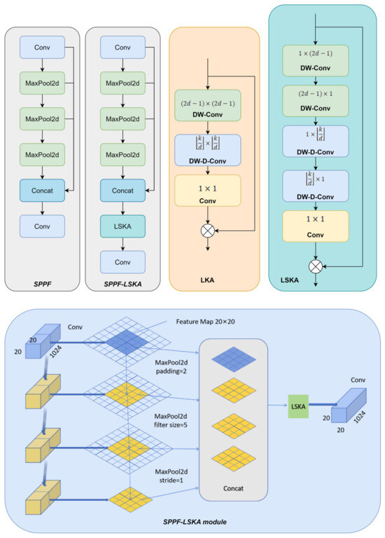 Comparison diagram of SPPF module improvement and different designs of large kernel attention module. Original LKA design in VAN including a standard depth-wise convolution (DW-Conv), a dilated depth-wise convolution (DW-D-Conv), and a 1 × 1 convolution. LSKA decomposed the first two layers of LKA into four layers, and each layer of LKA is formed by two 1D convolution layers. Notice that ⨂ represents Hadamard product, k represents the maximum receptive field, and d represents the dilation rate. The convolutional layers in this module adopt a kernel size of 5 × 5, stride of 1, and padding of 2.