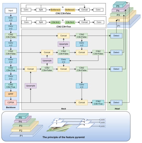 To enhance the detection and localization capabilities of small lesions in sugarcane leaf diseases, this study incorporates a dedicated small-object detection head into the improved YOLOv11 model [35], combined with a Feature Pyramid Network (FPN) architecture [36]. This integration effectively fuses low-level spatial details with high-level semantic information, thereby strengthening multi-scale feature processing capabilities. The structural schematic of this design is illustrated in Figure 4. This approach significantly improves the model’s robustness and detection performance in complex backgrounds, providing strong support for the precise identification and classification of minute lesions.