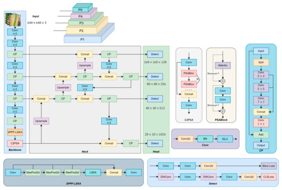 In the proposed detection framework, four prediction heads (P2–P5) are employed to handle targets of different scales. Each detection layer corresponds to a specific search grid, where each grid cell serves as an anchor point to predict the object’s bounding box offsets and class confidence scores. The dense search grid in lower layers (e.g., P2 and P3) focuses on small objects, while the coarser grids in higher layers (e.g., P4 and P5) are responsible for larger targets. This hierarchical search strategy enables the model to achieve a balance between detection accuracy and computational efficiency.