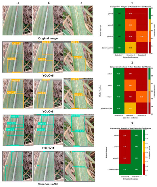 Comparison chart and corresponding heatmap of CaneFocus-Net model and YOLO series model test results. (a), (b) and (c), respectively, represent three different validation set images. The numerical values shown in the images indicate the confidence scores, which represent the probability that the model predicts the detected region as the corresponding disease class. (1), (2) and (3) are heatmaps corresponding to the comparison of several models for images (a), (b), and (c), respectively.