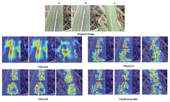 Figure 8 demonstrates that the CaneFocus-Net model exhibits a significant advantage in sugarcane leaf disease detection, particularly in typical lesion areas such as rust disease. The model’s bounding boxes precisely cover both the edges and central regions of the lesions, reflecting strong feature extraction and localization capabilities. Moreover, as illustrated in Figure 9, CaneFocus-Net visually suppresses false activations on background textures such as leaf veins, grass debris, and specular highlights, while concentrating its attention more effectively on true lesion regions. In contrast, models such as YOLOv5, YOLOv8, and YOLOv11 show issues including bounding box misalignment, incomplete coverage, or false detections, resulting in noticeably inferior recognition performance compared to CaneFocus-Net. This superiority provides an efficient and reliable technical foundation for intelligent recognition of sugarcane leaf diseases and automated agricultural disease diagnosis.
