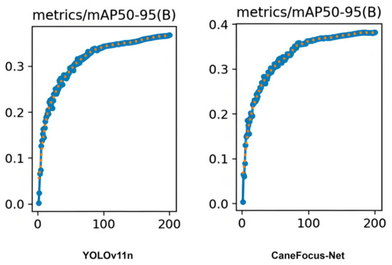 Figure 11 compares the mAP50-95 curves of YOLOv11n and CaneFocus-Net over the training epochs. As observed, CaneFocus-Net converges slightly faster and with smoother dynamics during the early training phase, suggesting improved training stability. However, both models reach similar plateau levels of approximately 0.36–0.38 mAP50-95, implying that the performance gain is primarily attributed to the architectural capacity introduced by CP and LSKA modules rather than optimization dynamics.