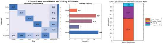 The experimental results demonstrate that the CaneFocus-Net model achieves mAP50 and mAP50-95 scores of 61.9% and 38.2%, respectively, significantly outperforming mainstream models such as YOLOv11n and YOLOv8n, while maintaining reasonable GFLOPs and model size. The incorporation of the P2 small-object detection head, multi-scale fusion modules, and attention mechanisms effectively enhances the model’s ability to detect small lesions on leaves, exhibiting particularly robust performance under complex backgrounds and varying natural lighting conditions. The normalized confusion matrix and class-wise accuracy of CaneFocus-Net are presented in Figure 12. The numbers of training and validation images for each category, along with the corresponding mAP values, are presented in Table 10.