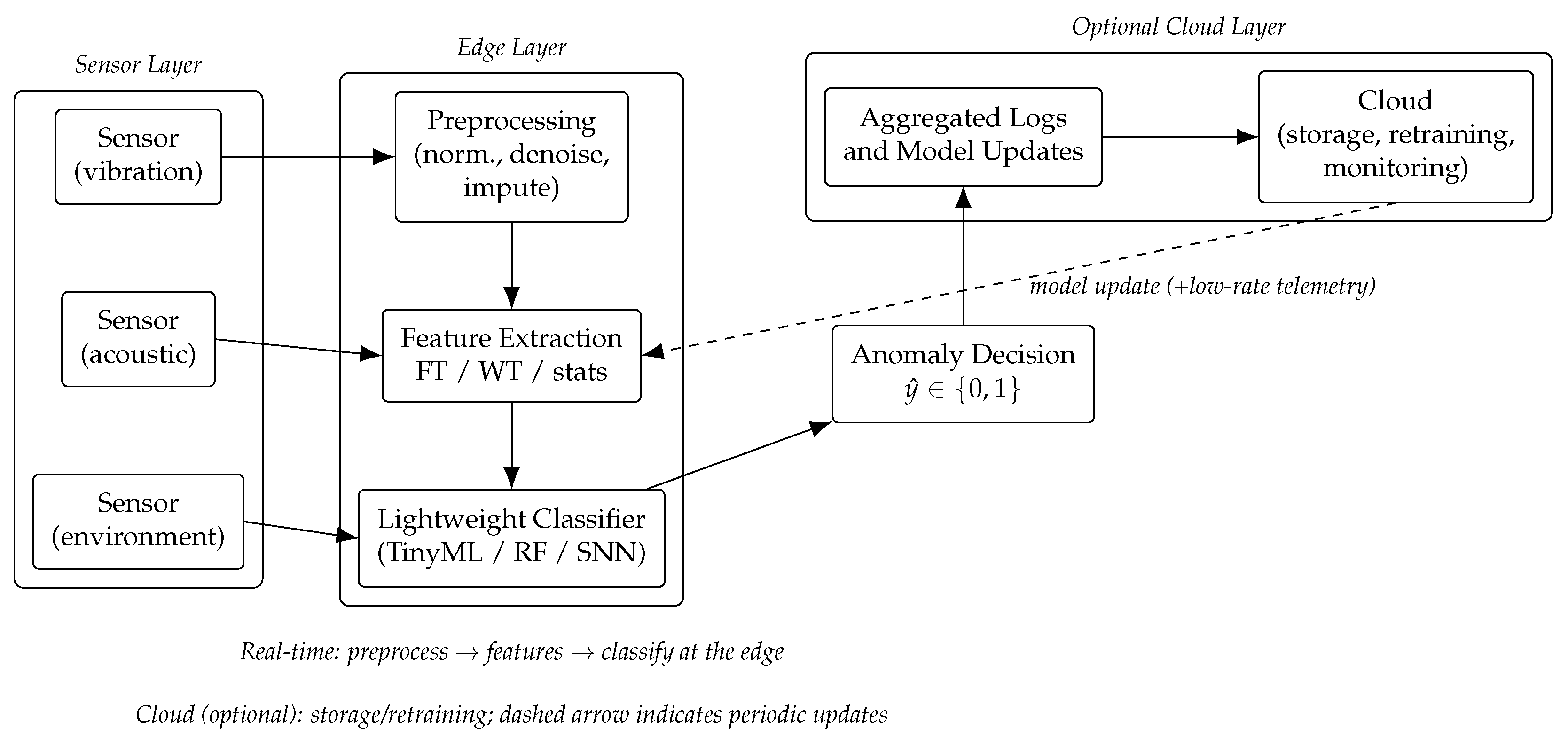 Edge layer: local preprocessing, feature extraction, and lightweight anomaly detection. This reduces latency and bandwidth and ensures partial autonomy even without cloud connectivity.