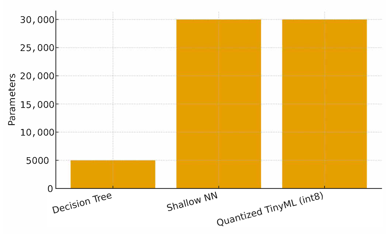 Figure 2 illustrates the simplified architectures of the three lightweight classifiers considered: Decision Tree (DT), Shallow Neural Network (SNN), and Quantized TinyML model. DTs provide interpretable decision boundaries, SNNs balance accuracy and model size through a single hidden layer, and TinyML models employ post-training quantization for deployment on microcontrollers. Each architecture was implemented with minimal parameter counts to fit within typical MCU memory constraints.