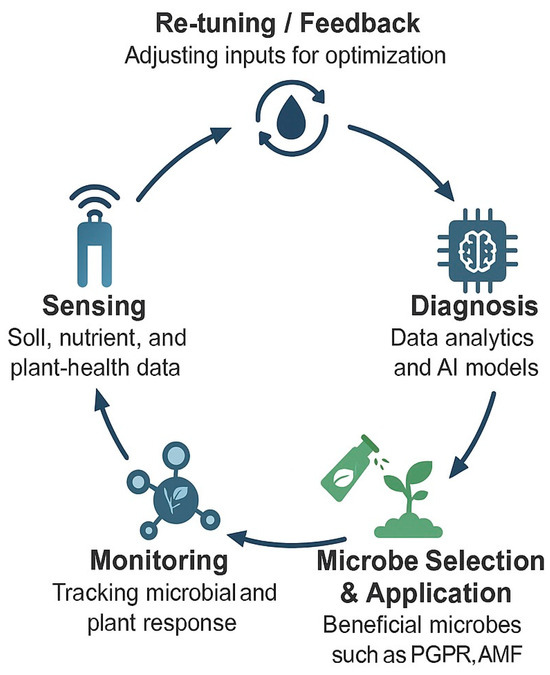 Sustainability is one of the foremost priorities of 21st-century agriculture, emphasizing efficient resource utilization, environmental protection, and long-term food security. Within this framework, smart farming leverages intelligent monitoring systems and microbial-based technologies to produce only what is required for optimal yield and minimal waste. These digital-biological tools establish a self-regulating feedback loop that continuously adapts to environmental changes and production needs, thereby enhancing both productivity and resource efficiency [43]. A healthy and diverse soil microbiota forms the foundation of agricultural sustainability, maintaining nutrient cycling, soil structure, and resilience against biotic and abiotic stresses. However, excessive reliance on synthetic fertilizers and pesticides has disrupted these ecological functions, posing serious risks to soil fertility, ecosystem balance, and human health. Restoring sustainability requires the integration of four complementary strategies: (1) the application of beneficial microorganisms to stimulate plant growth and restore soil vitality, (2) bioremediation to detoxify environmental contaminants, (3) improved nutrient cycling through organic and microbial inputs, and (4) biological control to manage pests and diseases naturally [21]. The incorporation of sensor technologies further strengthens these strategies by providing real-time insights into soil moisture, nutrient availability, and microbial activity. This enables data-driven adjustments that minimize agrochemical inputs and optimize energy efficiency. The combined advancement of microbial inoculants, organic amendments, and precision-monitoring devices represents a clear pathway toward sustainable intensification—achieving global food security while safeguarding environmental integrity [10,18,20].