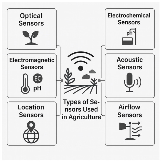 Sensor technologies form the core component of smart agriculture by providing continuous, high-resolution data on environmental and biological processes. They can be broadly classified into six major functional categories: optical, electromagnetic, electrochemical, location, acoustic, and airflow sensors [28] (Figure 2). Each type contributes unique data streams that, when integrated through IoT networks and analytical models, support precision decision-making and automated management.