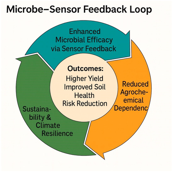 Conceptual framework of the Microbe–Sensor Closed Loop (MSCL), illustrating the continuous feedback cycle between sensor-based diagnosis and microbial application for adaptive, data-driven management in sustainable smart agriculture. The framework integrates real-time sensor data (e.g., soil moisture, nutrient levels, and plant physiological parameters) with microbial interventions such as biofertilizers, biostimulants, and biocontrol agents. Arrows represent the bidirectional information and response flow between sensing systems and microbial applications, forming a closed feedback loop that enables precision adjustment of inputs based on field data. This conceptual model underlines how linking biological processes with sensor networks can enhance resource efficiency, productivity, and environmental sustainability.
