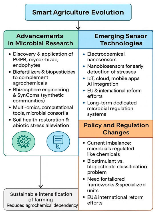 Flow schematic summarizing the future trends and transformative directions in smart agriculture. The diagram highlights three core pillars driving this evolution: (1) advancements in microbial research, focusing on the development of multifunctional biofertilizers, biostimulants, and biocontrol agents that enhance plant productivity and resilience; (2) emerging sensor technologies, including next-generation IoT devices, remote sensing platforms, and machine-learning-driven data analytics for real-time monitoring and adaptive management; and (3) evolving policy and regulatory frameworks, aimed at harmonizing biosafety standards, encouraging sustainable practices, and promoting innovation in agri-biotechnology. Arrows indicate the flow of innovation and feedback among these domains, showing how scientific, technological, and regulatory progress converge to reduce agrochemical dependency, restore soil health, improve climate resilience, and ensure sustainable intensification of farming systems.
