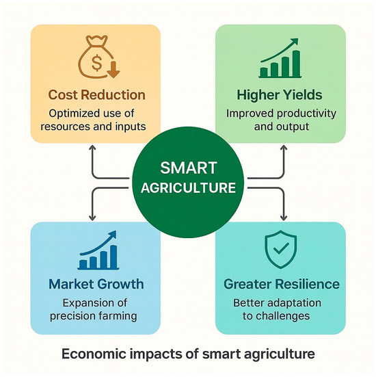 Sustainable agriculture encompasses a set of innovative practices designed to meet current and future food demands without compromising the health of ecosystems or the well-being of future generations. These approaches aim to protect the environment, enhance energy efficiency, and reduce ecosystem degradation, while maintaining economic viability and social equity [47]. Transitioning toward sustainability offers multidimensional benefits, extending beyond environmental preservation to include economic gains, social development, and technological innovation. The key outcomes of such systems include (1) enhanced soil fertility and microbial diversity, ensuring long-term productivity and resilient soil ecosystems; (2) reduced chemical input costs through the use of biofertilizers and precision nutrient management, guided by real-time sensor feedback; (3) improved community well-being through local employment opportunities, empowered farmer participation, and the establishment of resilient food systems; and (4) lower environmental footprint, achieved by minimizing soil erosion, nutrient leaching, and chemical pollution in agroecosystems [48,49]. Ultimately, the integration of renewable energy sources, beneficial microbial technologies, and sensor-driven decision support systems establishes a holistic smart-sustainability framework that aligns food production with environmental stewardship and climate resilience. This approach ensures that agricultural growth continues without exhausting the natural capital essential for future development [10,18].
