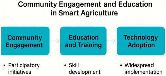 In addition to technical and economic challenges, the regulatory and social dimensions of smart agriculture present significant barriers to large-scale adoption. Regulatory frameworks governing microbial inoculants, genetically modified organisms (GMOs), and IoT-enabled devices remain fragmented and inconsistent across regions, leading to uncertainty for producers, distributors, and end-users. In many countries, standardized procedures for efficacy testing, biosafety evaluation and product certification are lacking, resulting in variable quality assurance and reduced market confidence [52]. Social factors are equally important in determining adoption success. Farmer reliance on traditional agrochemical practices, limited awareness of microbial and digital innovations, and concerns about data privacy in IoT systems collectively contribute to low acceptance rates. Additionally, disparities in digital literacy—especially among smallholders, older farmers, and rural communities—further limit participation in technology-driven initiatives. To address these challenges, policy harmonization and the development of transparent, science-based guidelines for product registration, biosafety assessment, and data management are essential. Establishing national certification systems and extension programs would strengthen market trust and ensure consistent regulatory oversight. On the social side, capacity-building initiatives, including demonstration farms, hands-on training, and participatory workshops, can enhance awareness and build farmer confidence in both microbial and digital technologies. Bridging the gap between scientific research, policy development, and community engagement will accelerate the social integration of smart agriculture and ensure that its benefits are distributed equitably across different farming systems and socioeconomic contexts [11,52,54].