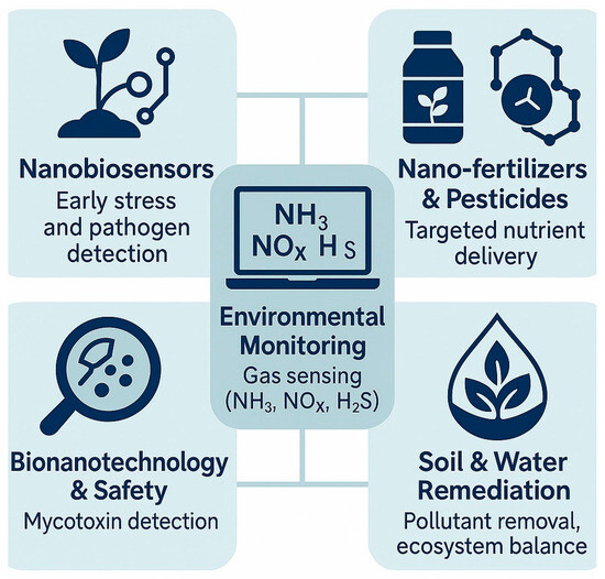 Nanotechnology offers transformative possibilities for advancing smart and sustainable agriculture, reshaping how food systems manage inputs, monitor stress, and protect ecosystems. Its applications range from real-time sensing and targeted nutrient delivery to environmental remediation, positioning nanotechnology as a critical interface between microbial biotechnology and precision agriculture [10,11]. One of the most significant innovations in this field is the development of nanobiosensors capable of detecting early-stage plant stresses—including nutrient deficiencies, drought, or pathogen attacks—long before visible symptoms appear. These tools enable proactive management decisions, minimizing yield losses and improving crop resilience. By providing continuous, field-based diagnostics, nanobiosensors strengthen decision-support systems in precision farming, improving the timing and efficiency of microbial inoculant and fertilizer applications [23,75]. In parallel, nano-enabled fertilizers and pesticides-including nanoparticle-based formulations-facilitate site-specific and controlled delivery of essential nutrients and active ingredients. This innovation enhances nutrient-use efficiency, reduces application frequency, and substantially decreases chemical leaching and runoff. As a result, resource utilization becomes more efficient, while mitigating soil and water pollution associated with conventional agricultural practices [75,76]. Nanobiosensors, when embedded within smart-farming networks, can monitor a wide array of agro-environmental parameters, including nutrient concentrations, metabolite levels, pathogen presence, soil moisture, and temperature-transmitting real-time data to farmers for adaptive field management. For instance, electrochemically functionalized carbon nanotube and metal nanoparticle-based sensors can detect trace gases such as ammonia (NH3), nitrogen oxides (NOX), and hydrogen sulfide (H2S)—key indicators of soil and air quality—thereby assisting in pollution control and crop-health assessment [76]. Recent breakthroughs in bionanotechnology have accelerated the creation of high-sensitivity biosensors capable of detecting mycotoxins and other hazardous analytes that threaten crop safety and human health. Beyond monitoring applications, nanomaterials also offer promising solutions for soil and groundwater remediation. Nanoscale oxides and biogenic nanoparticles can immobilize or degrade pesticide residues, heavy metals, and excess nutrients, thereby contributing to the restoration of ecological balance [77]. Despite their immense potential, the successful deployment of nanotechnology in agriculture depends on farmer education, capacity-building and comprehensive field validation. Training programs are essential to familiarize growers with the operation, safety, and economic advantages of nanotechnology-based systems. Furthermore, extensive field trials are required to validate laboratory findings under real-world cultivation conditions, ensuring scalability, cost-effectiveness, and environmental safety [23,78]. Collaborative engagement among research institutions, industry stakeholders, and policymakers will be crucial to ensure that nanotechnology-driven agriculture evolves in a responsible, equitable, and sustainable manner—supporting the broader goals of climate-smart, eco-efficient, and data-enabled farming systems.
