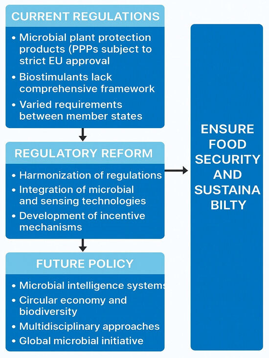 Regulatory and policy roadmap for smart agriculture, illustrating the progressive transition from current European Union (EU) frameworks toward future global strategies that integrate microbial technologies, sensor systems, and sustainability-oriented policies. The figure outlines three developmental stages—Current Regulations, Regulatory Reform, and Future Policy Directions—each connected by directional arrows representing policy evolution and feedback mechanisms. The Current Regulations stage highlights existing EU directives governing agrochemical use, biosafety, and environmental protection. The Regulatory Reform phase emphasizes harmonization of microbial inoculant standards, the inclusion of sensor-based monitoring in compliance systems, and the incorporation of digital traceability tools. The Future Policy stage projects a globally coordinated framework aligning biotechnology innovation, nanotechnology applications, and smart sensing networks with the United Nations Sustainable Development Goals (SDGs). This roadmap underscores how integrative and adaptive policy design can foster innovation, ensure biosafety, and advance sustainability in the era of smart agriculture.