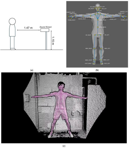 Full-body kinematic data were captured as RGB-D (color + depth) frames using the Azure Kinect DK (Microsoft, Redmond, WA, USA). RGB-D frames were recorded with the Azure Kinect Sensor SDK and processed with the Azure Kinect Body Tracking SDK (v1.1.x) to estimate 3D positions of 32 anatomical joints using a deep learning model [17,18,19,20]. The camera was mounted 1.15 m above the floor and positioned 1.47 m in front of the participant (frontal view) to minimize occlusion (Figure 2a). Joint naming and hierarchy followed the Azure Kinect Body Tracking SDK (Figure 2b). To illustrate the tracking output, Figure 2c shows an example frame with the 32-joint skeleton overlaid on the depth image, and Supplementary Video S1 provides a short clip presented sequentially—RGB, then depth, then depth with skeleton overlay (≈5 s each).