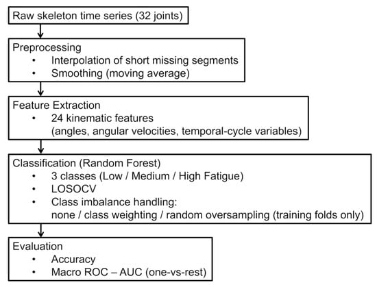 Features were computed on a per-cycle basis; unless stated otherwise, results aggregate three consecutive cycles by averaging to reduce variance. Windows were non-overlapping, and Borg CR10 labels recorded every 30 s were aligned to the nearest timestamp. Figure 3 summarizes the end-to-end processing pipeline—from RGB-D capture and body tracking to preprocessing, feature extraction, and classification/evaluation. Note that the 24 kinematic features constitute the model input representation; evaluation is based on classification metrics—accuracy and macro ROC AUC (one-vs-rest)—reported under LOSO.