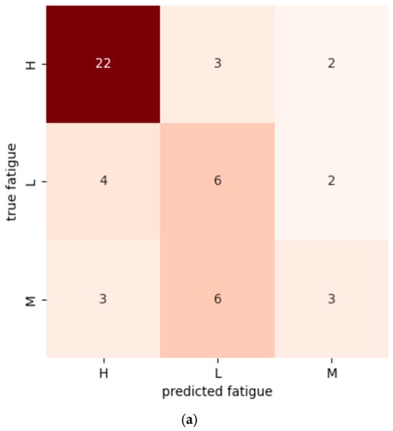To address class imbalance, we compared three strategies within each training fold only: (i) no correction; (ii) class weighting (class_weight = “balanced” in scikit-learn), where the weight for class c was set to w c = N K n c with N the number of training samples in the fold, K the number of classes (=3), and n c the count of class c in that fold; and (iii) uniform random oversampling with replacement by duplicating minority-class samples until an exactly balanced 1:1:1 ratio (Low/Medium/High) was reached. In each fold, the target per-class size equaled the majority-class count in that training fold. All resampling used random_state = 42 for reproducibility and was applied only to the training folds; the held-out subject’s data were never reweighted or resampled. No synthetic sample generation (e.g., SMOTE) was used.