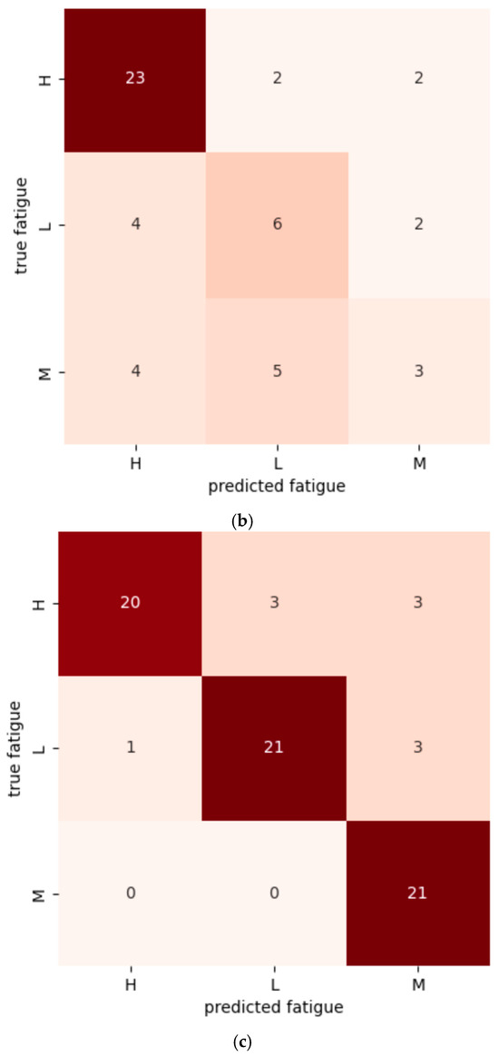 Confusion matrices are presented in Figure 5. Without correction, frequent misclassification occurred between Low and Medium fatigue levels. Class weighting reduced this tendency, while oversampling yielded a more balanced and accurate classification across all three classes.