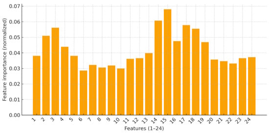Figure 6. Feature importance of the 24 kinematic features (see Table 2 for feature definitions) after oversampling, calculated using the random forest classifier.