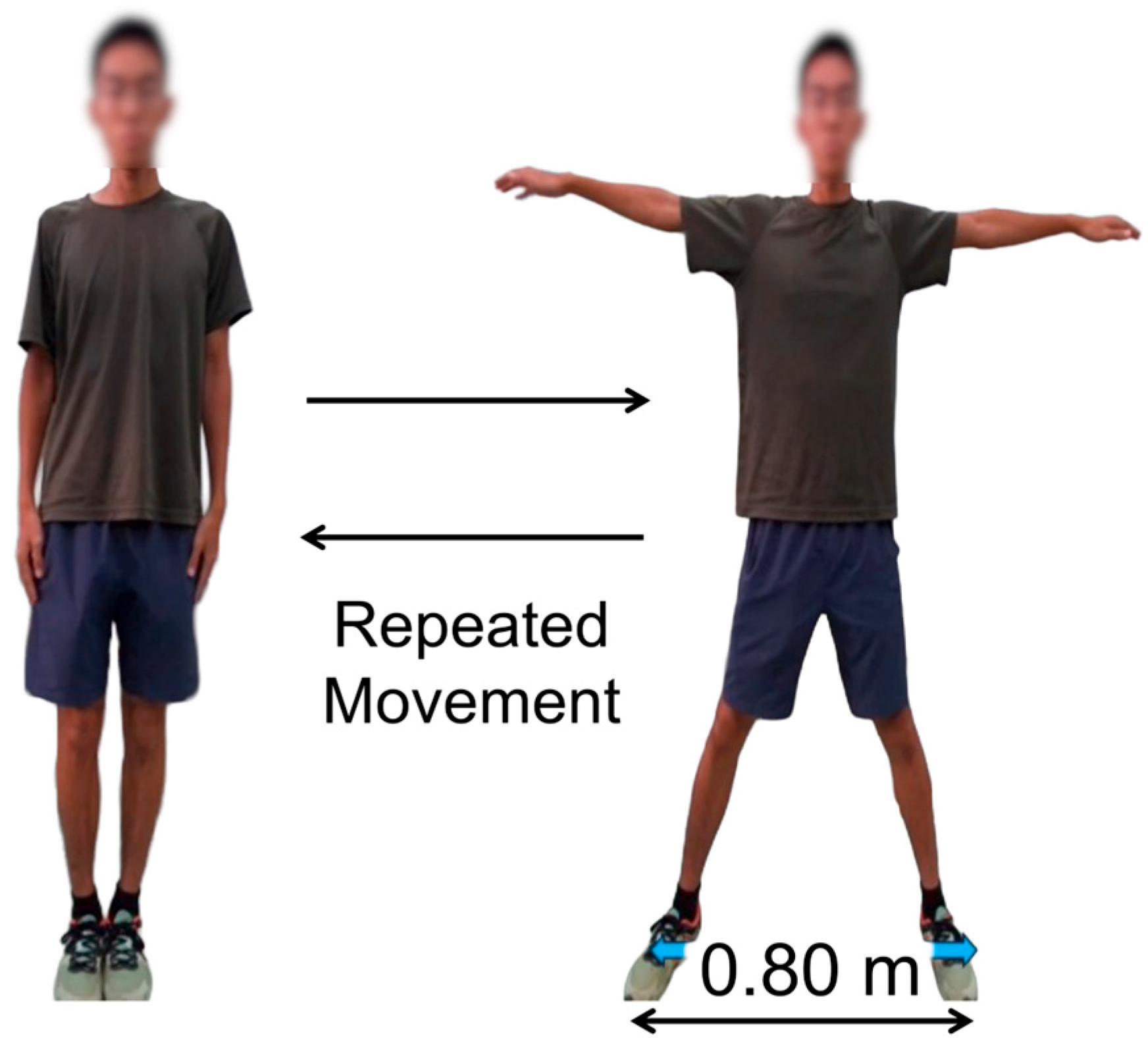 Figure 1. Repeated whole-body movement used for data collection: participants alternated between a neutral stance and an arms-abducted posture at a self-selected pace; stance width was approximately 0.80 m.