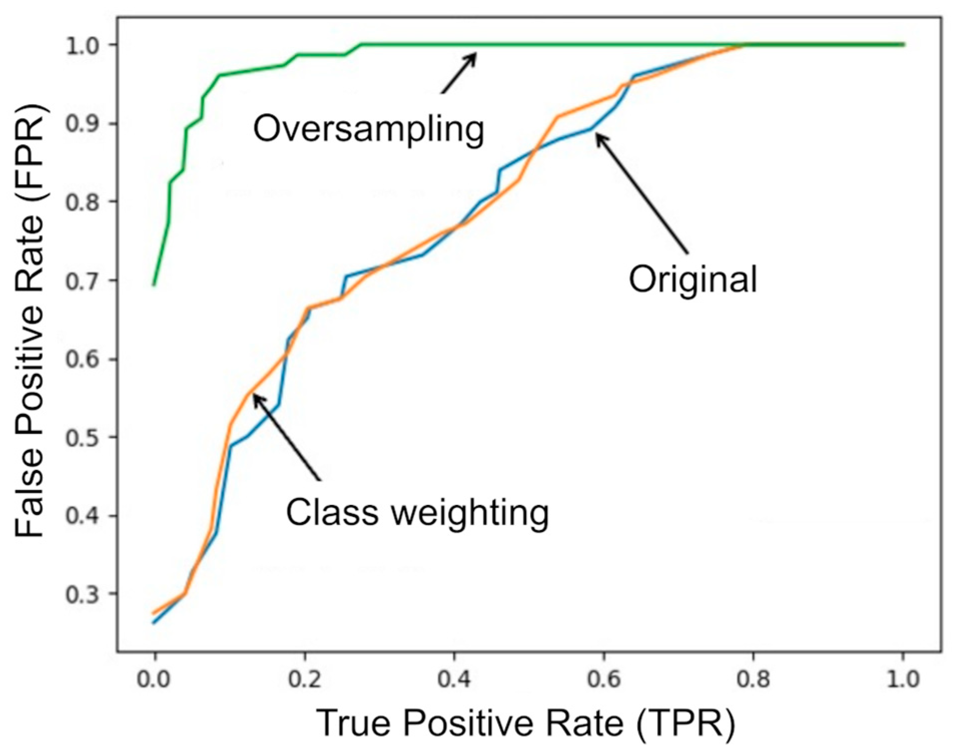 Figure 4. ROC curves of the random forest classifier under three imbalance correction strategies: original (no correction), class weighting, and oversampling.