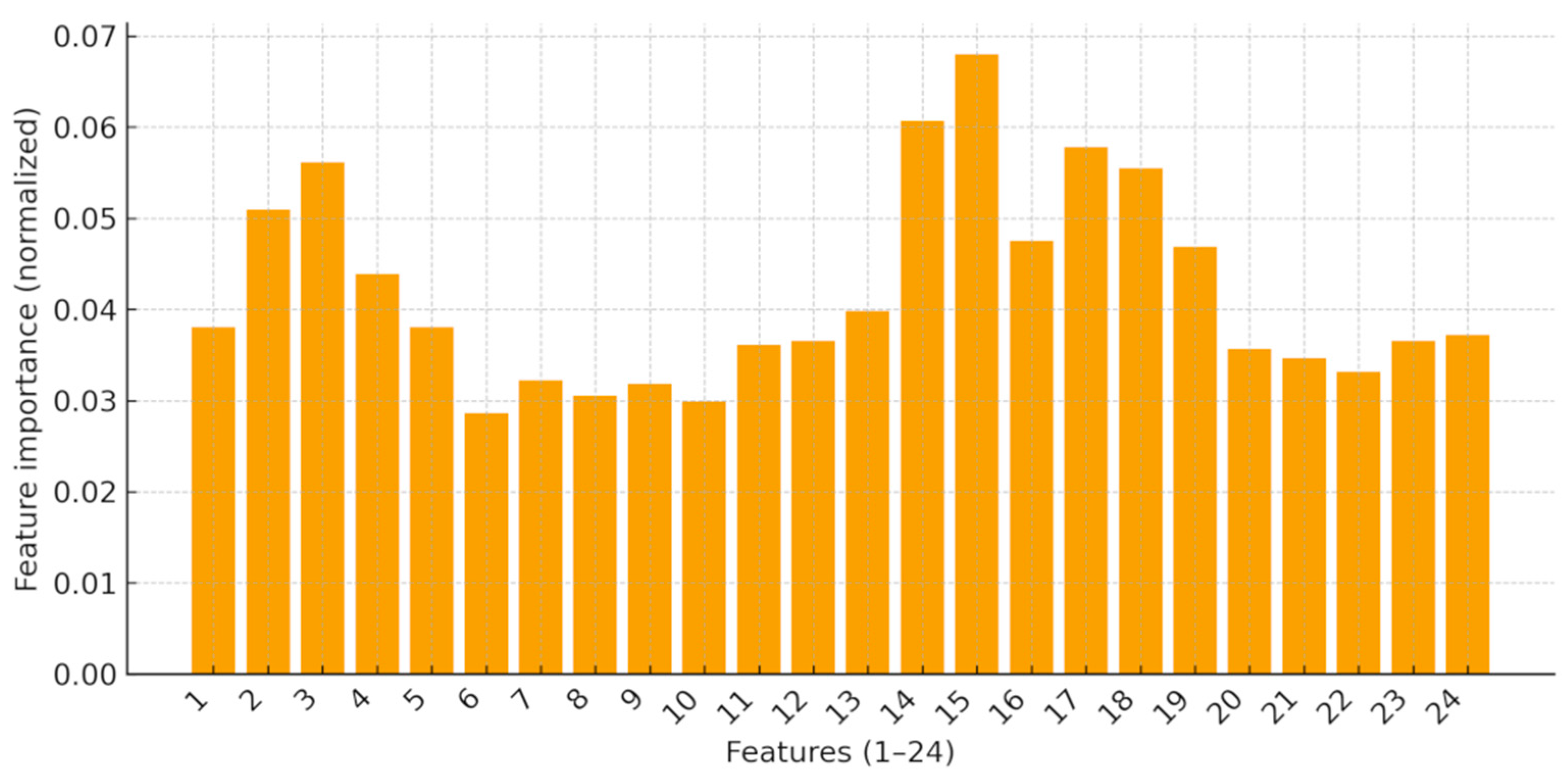 As described in Section 3.5, we computed impurity-based random forest feature importances and qualitatively inspected their distribution. To relate model behavior to anatomy, we grouped features into coarse anatomical regions (e.g., trunk; hip–knee–ankle; upper limb). This inspection suggested that importances were distributed across regions rather than concentrated in a single segment. In future work, we will apply permutation importance and SHAP to windowed features to quantify segment-wise, time-resolved contributions while keeping the non-contact pipeline unchanged.